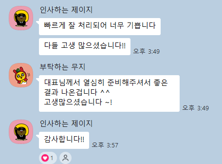 대표님께서도 빠르게 처리가되어 기쁘시다고 감사인사를 해주셨습니다